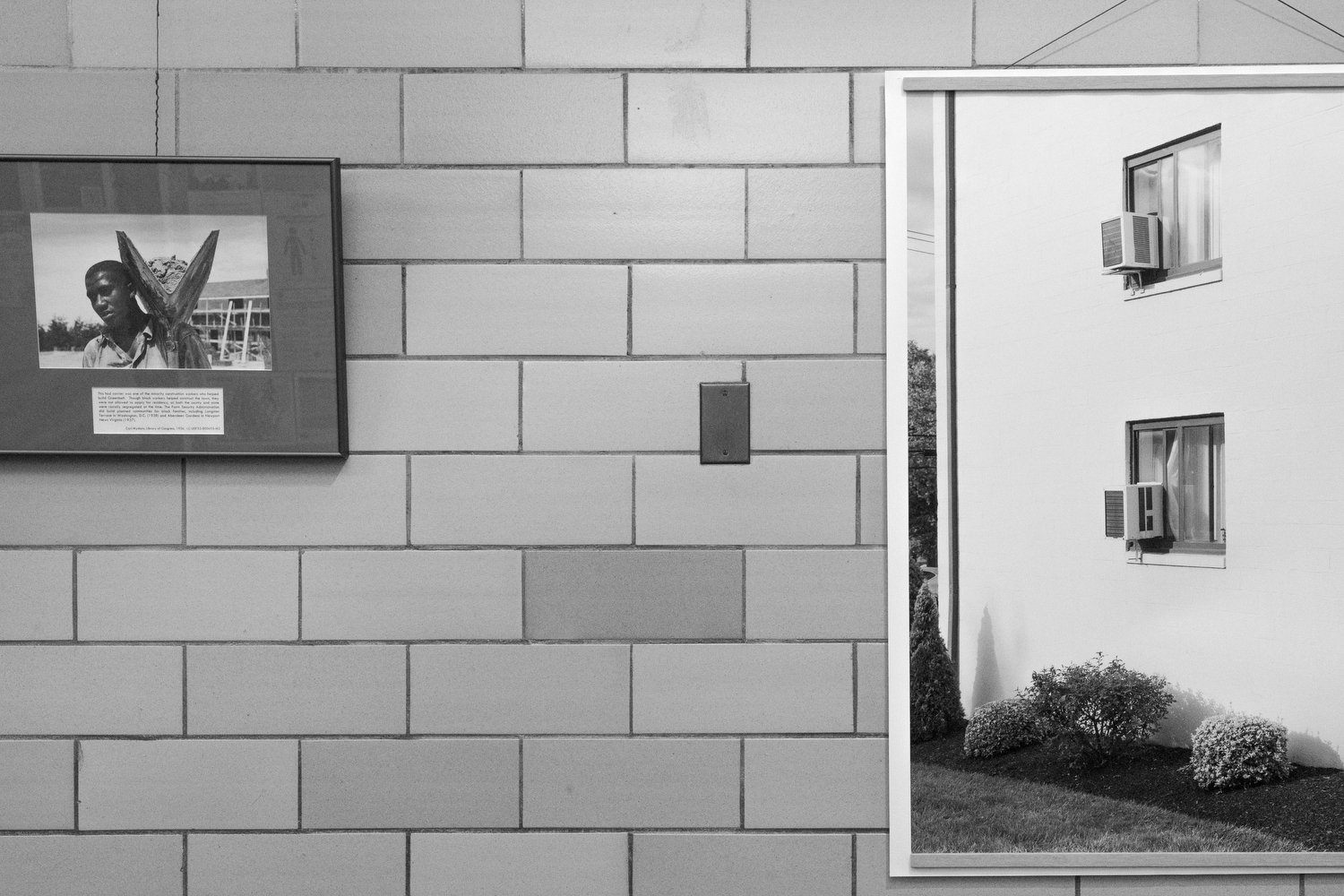Installation view of NEXT 2024 exhibition at the Corcoran Gallery of Art, George Washington University. Vinyl print and stick of researched archival images mounted directly to wall. Framed inkjet prints of contemporary images created by the artist displayed on top.